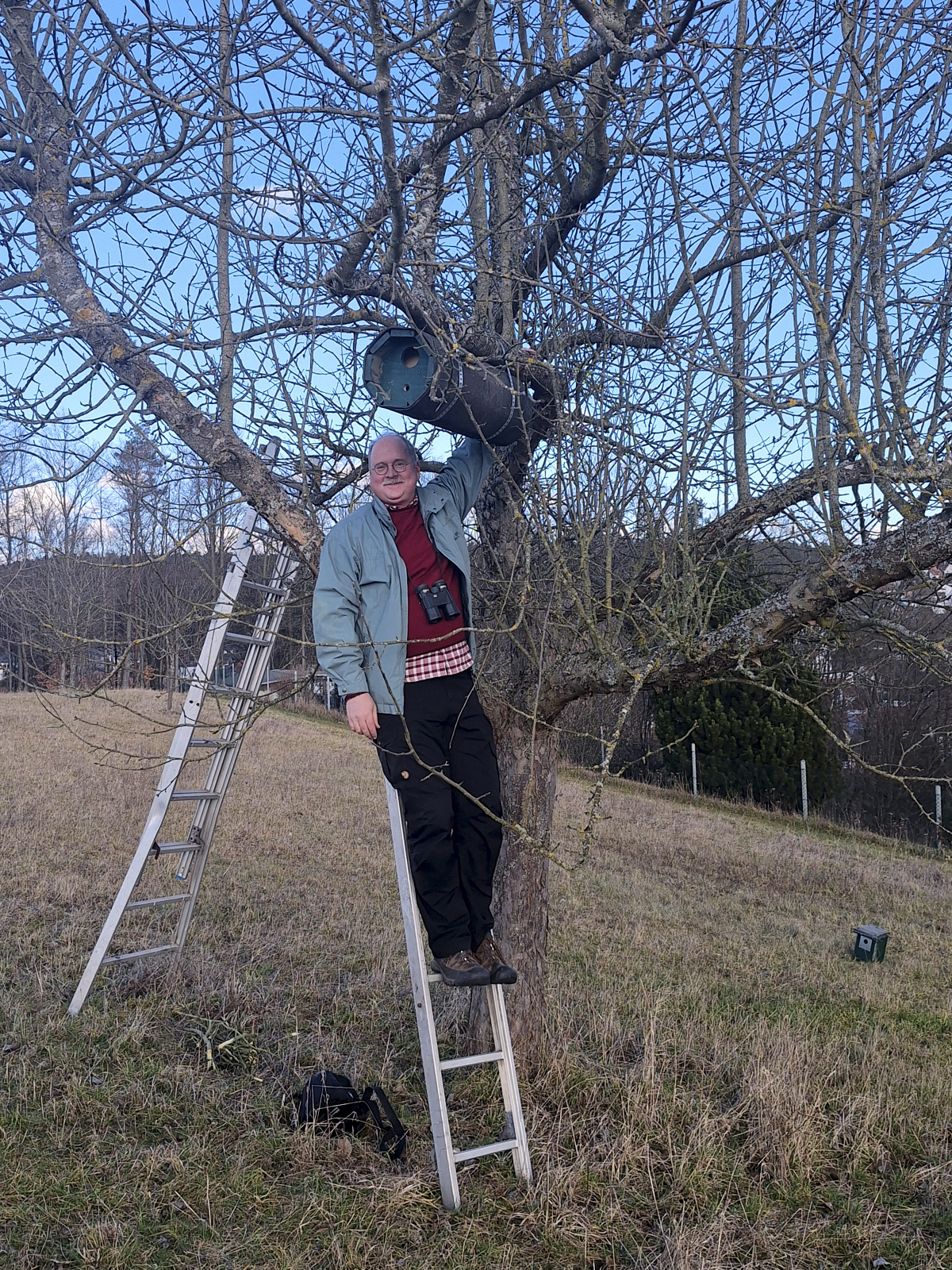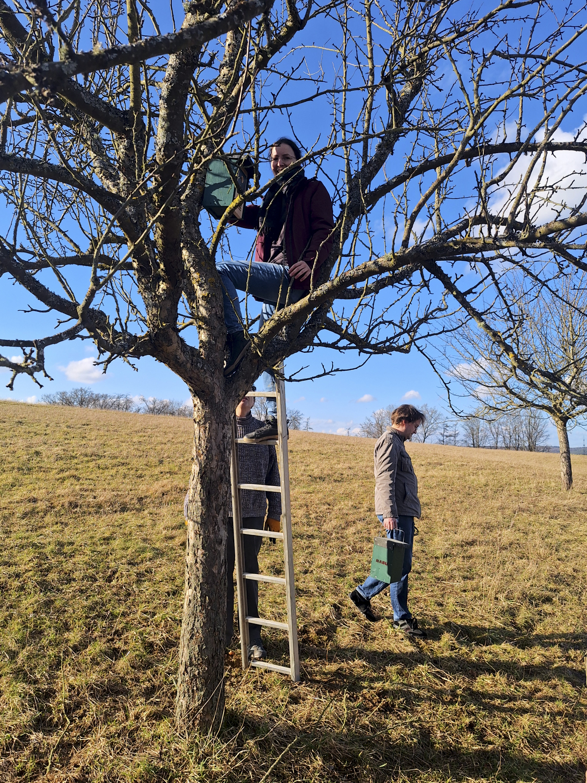 Bei Morlautern haben wir für zwei Streuobstwiesen die Ernte übernehmen dürfen. Selbstverständlich versuchen wir dort auch eine Gegenleistung zu erbringen und etwas Gutes für die Natur zu tun. Eine Maßnahme ist das Aufhängen von 10 Nisthilfen in den Obstbäumen.