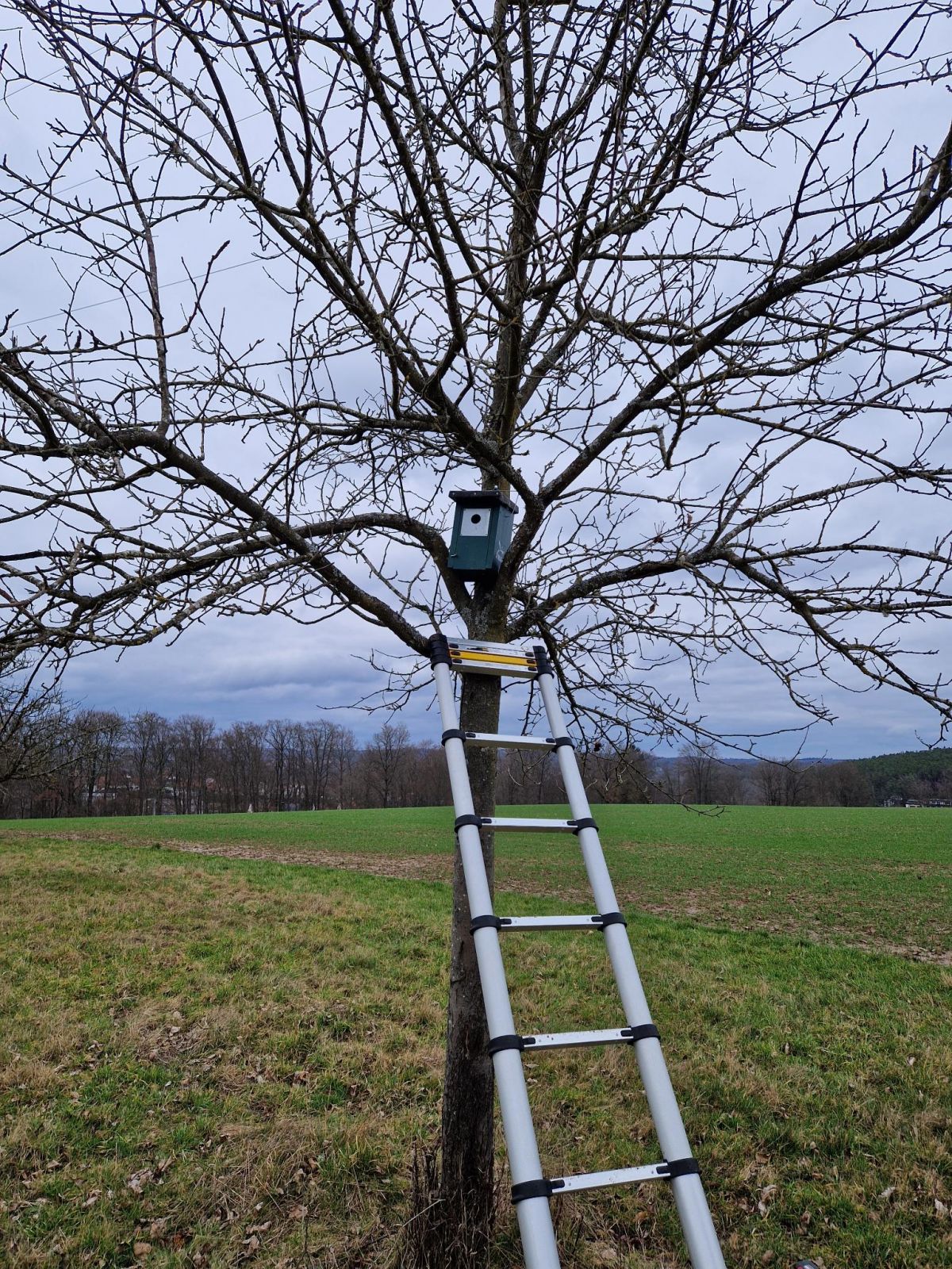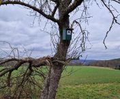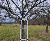 Die 6 angebrachten, neuen Nisthilfen werden voraussichtlich insbesondere Kohl- und Blaumeisen eine geeignete Nistmöglichkeit bieten. Insgesamt gibt es damit nun 12 Nistkästen und eine Steinkauzröhre auf den beiden Streuobstwiesen im Norden Morlauterns. Alle Nistkästen wurden außerdem mittels einer App erfasst, wodurch die jährliche Reinigung unkompliziert dokumentiert werden kann.