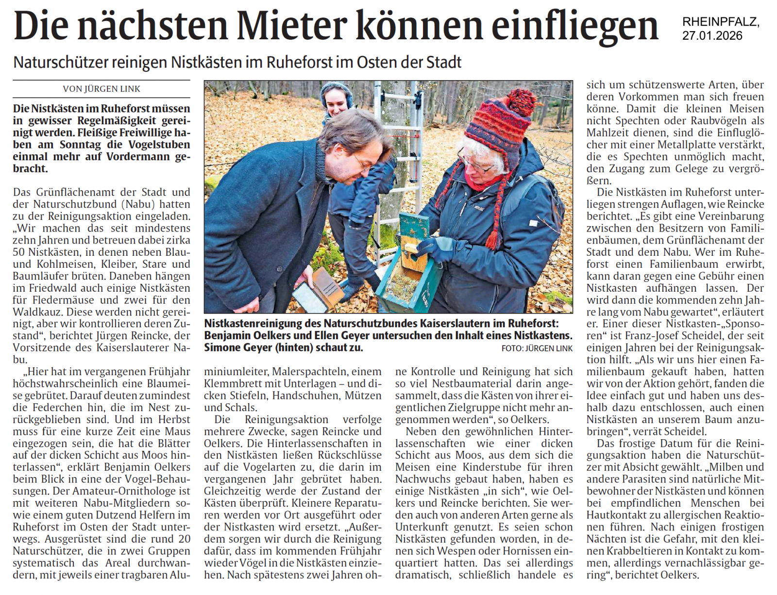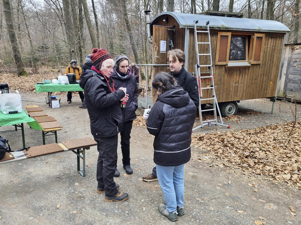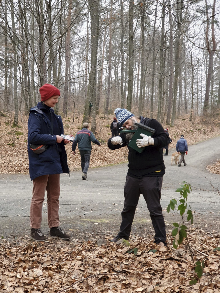 Im Ruheforst Kaiserslautern hängen inzwischen 50 Nistkästen. Gemeinsam mit Kai Kehl vom Stadtforst und Gästen haben wir bei kaltem, aber trockenem Winterwetter die alten Nester entfernt. Diesmal haben wir alle Nistkästen mithilfe unserer Smartphones und der Nistkasten-App des NABU erfasst. Das macht es uns zukünftig erheblich leichter die Kästen zu finden, die Ergebnisse zur Belegung und zum Zustand und die Auswertung über die Jahre zu machen. Zur Belohnung gab es danach Wildbratwürste vom Grill, eine heiße Gemüsesuppe und Glühwein. Es war wieder mal ein perfekter Tag (Fotos anschauen!).