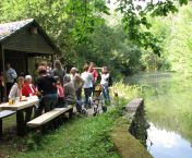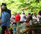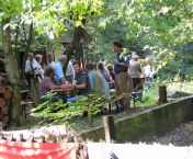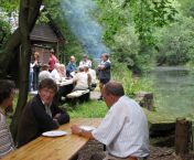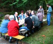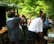 Ebenfalls sehr gefreut haben wir uns über die erneute Teilnahme von Frau Lüderssen, diesmal mit ihrem Schwiegersohn Herrn Walther. Der Familie Lüderssen gehören unter Anderem der kleine Friedhof vor unserer Hütte und das Tal mit dem Bachlauf und den ehemaligen Fischanzuchtbecken hinter unseren Teichen. Sie sind daher unsere direkten Nachbarn. Mitgebracht haben Sie uns sehr interessante, historische Unterlagen über unser Tal und über den Ort Diemerstein. Teile seiner umfangreichen, geschichtlichen Informationen sind auch hier veröffentlicht: http://www.frankenstein-historie.de. Vielen Dank.