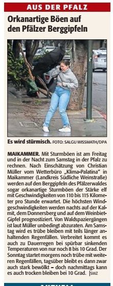 Der Wetterdienst warnt für die Nacht von Freitag auf Samstag vor orkanartigen Sturmböen bis zur Windstärke 9, die RHEINPFALZ sogar bis Windstärke 11 in der Pfalz. Das sind Windgeschwindigkeiten von 80 bis 115km auf den Berggipfeln vom Pfälzerwald bis Donnersberg. Außerdem ist für Samstag Dauerregen angekündigt.